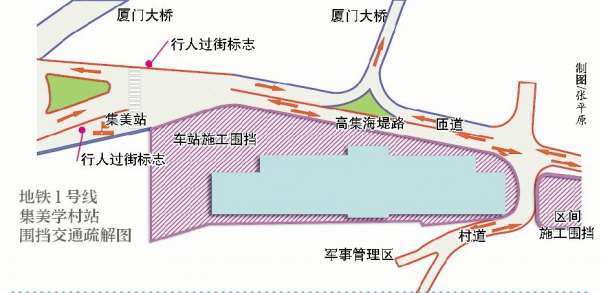厦门地铁1号线集美学村站施工围挡时间从2014年5月24日00:00起至2016年5月31日00:00。围挡位置在原集美火车站、高集海堤路,安装458米围挡(围挡面积9098平方米,长186.1米,宽60.6米)。为保证帆船帆板运动管理中心、军事管理区居民的通行,新建有8米村道。
