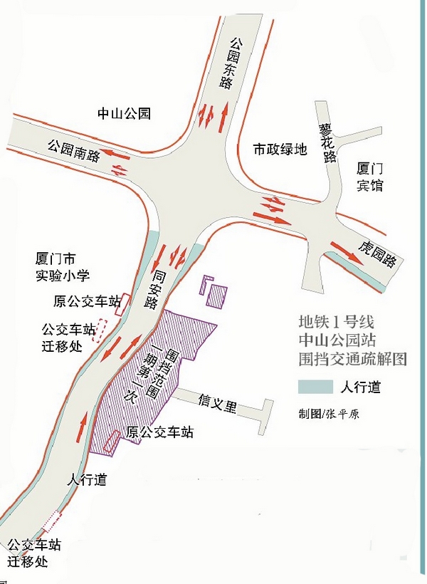 其中,厦门地铁1号线中山公园站计划于2014年5月24日0时至2016年5月19日24时,实行该站点主体工程一期施工第一次围挡。此次围挡主要在同安路东侧地块,围挡面积为8620平方米,围挡将占用同安路由南向北方向东侧路段两车道长约113米长,围挡期间车辆通过新建临时道路绕行。